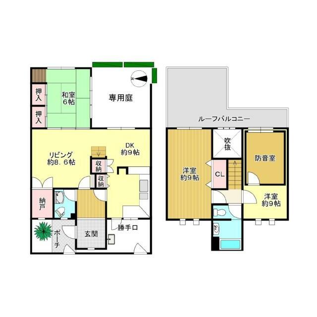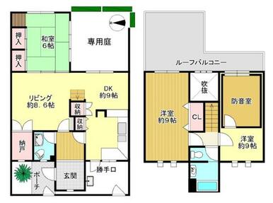 | 設備 | 収納スペース 室内洗濯機置場 クローゼット 都市ガス 専用庭 テラス 温水洗浄便座 | ||